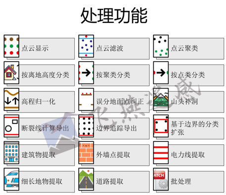 P3C是飛燕航空遙感技術(shù)有限公司開發(fā)的具備自主知識產(chǎn)權(quán)的機載激光雷達點云數(shù)據(jù)處理軟件,是Point Cloud Cluster & Classification的縮寫,具備海量點云讀寫、顯示、濾波、聚類、分類、矢量導(dǎo)出、批處理等功能(見圖 1)。P3C的主要優(yōu)點在于: