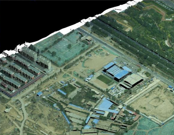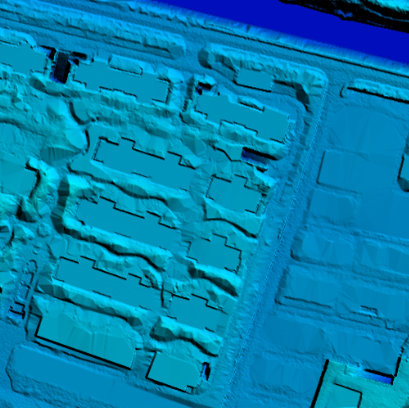 以分類點云中所有地表點以及地表之上的植被、建筑物、構(gòu)筑物等自然及人工地物表面形態(tài)上的點均作為特征點,并以帶有高程信息的面狀水域范圍線作為特征線,構(gòu)建并輸出數(shù)字表面模型(DSM)產(chǎn)品。