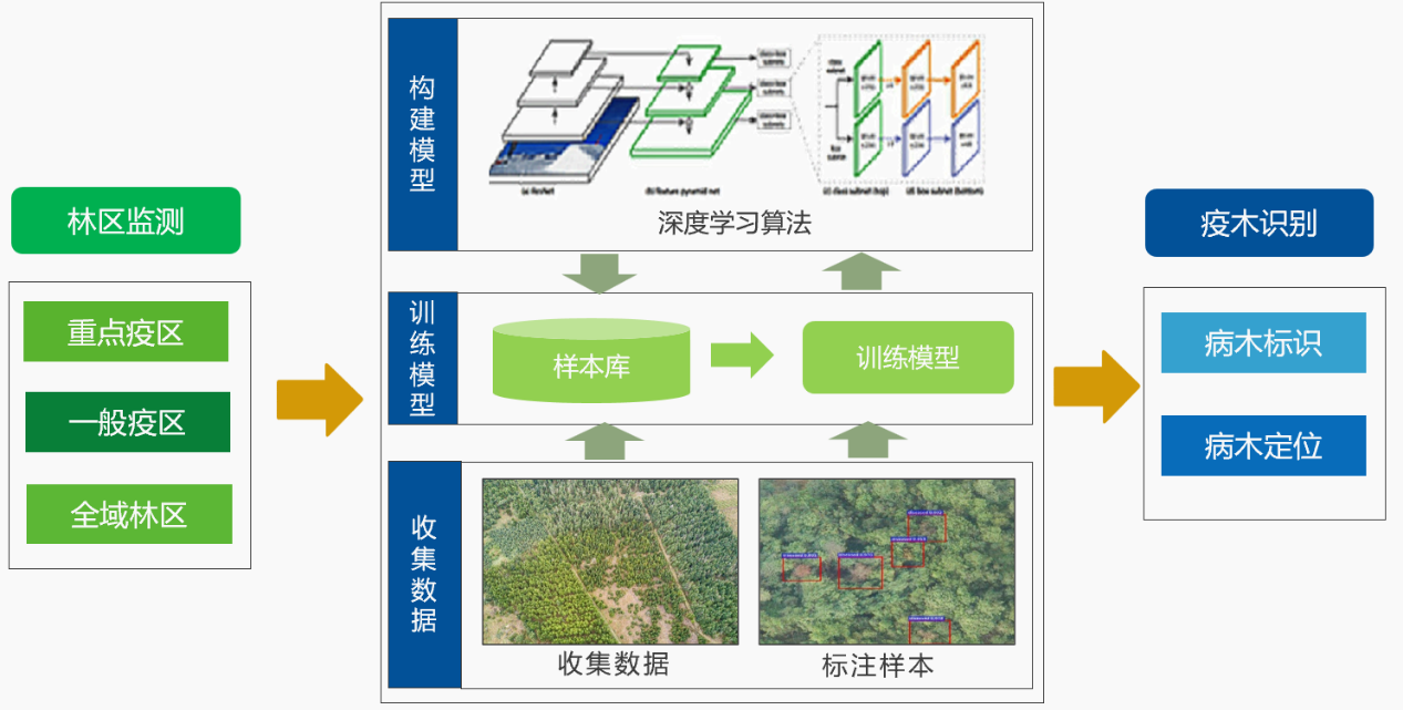 利用無人機(jī)、大飛機(jī)等監(jiān)測平臺(tái)采集林區(qū)數(shù)據(jù),依托自主研發(fā)識(shí)別AI算法,構(gòu)建人工智能數(shù)據(jù)樣本庫,覆蓋多時(shí)期、多樹種多脅迫等樣本數(shù)據(jù),以支撐高性能算法模型的訓(xùn)練和識(shí)別。