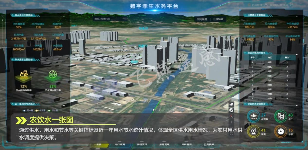 集成數(shù)字孿生技術(shù)、三維可視化技術(shù),通過建模渲染建立水務(wù)設(shè)施的結(jié)構(gòu)形狀和位置關(guān)系,實(shí)現(xiàn)物理對(duì)象的數(shù)字化表達(dá)。打通水務(wù)管理中各業(yè)務(wù)系統(tǒng)的數(shù)據(jù)孤島,實(shí)現(xiàn)水務(wù)工程的三維展示、全過程實(shí)時(shí)監(jiān)測、故障預(yù)警等,協(xié)助管理者一目了然地掌握業(yè)務(wù)趨勢(shì),獲取數(shù)據(jù)使用價(jià)值,完成高效率管理、運(yùn)營和決策。