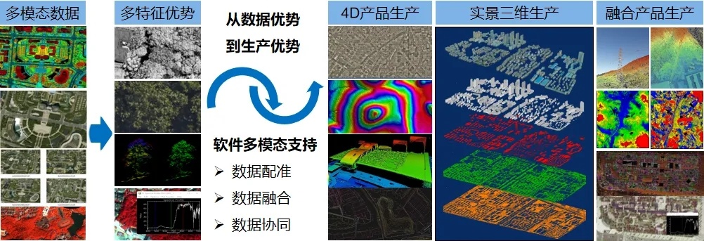 支持多源高分辨率影像聯(lián)合處理,通過對影像進行空三、密集匹配、構(gòu)網(wǎng)、紋理映射,輸出Mesh實景三維模型,結(jié)合激光點云數(shù)據(jù),生成DSM、DEM、DOMDLG等數(shù)據(jù)產(chǎn)品,豐富成果類型。