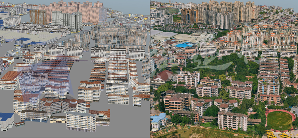 在LOD1.3模型建設(shè)中,充分利用多模態(tài)數(shù)據(jù)優(yōu)勢(shì),在簡(jiǎn)化和輕量化的基礎(chǔ)上進(jìn)一步提升建筑物模型紋理的真實(shí)性和城市樹木建模的豐富度。利用激光點(diǎn)云輔助生成高精度建筑物模型,利用傾斜影像映射參考紋理,通過對(duì)紋理分析、簡(jiǎn)化,讓模型表達(dá)更加真實(shí)。