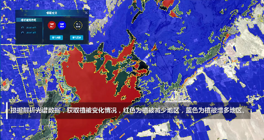 通過對(duì)不同時(shí)期遙感影像的植被情況進(jìn)行分析、比對(duì),通過NDVI(歸一化植被指數(shù))得出時(shí)間段內(nèi)的植被覆蓋的變化情況,并在底圖上進(jìn)行可視化處理,紅色部分為植被減少,藍(lán)色部分植被增多。通過植被情況從側(cè)面觀察掌握污染情況。