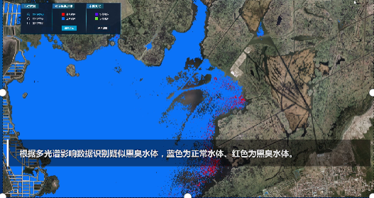 可對(duì)影像的高光譜信息對(duì)水體部分進(jìn)行處理、分類,通過光譜反射率對(duì)比(反射率低為污染水體)將疑似黑臭水體部分標(biāo)識(shí)為紅色,正常水體為藍(lán)色。通過不同年限的影像對(duì)比,獲取水體變化情況,紫色部分水體增多,綠色部分水體。