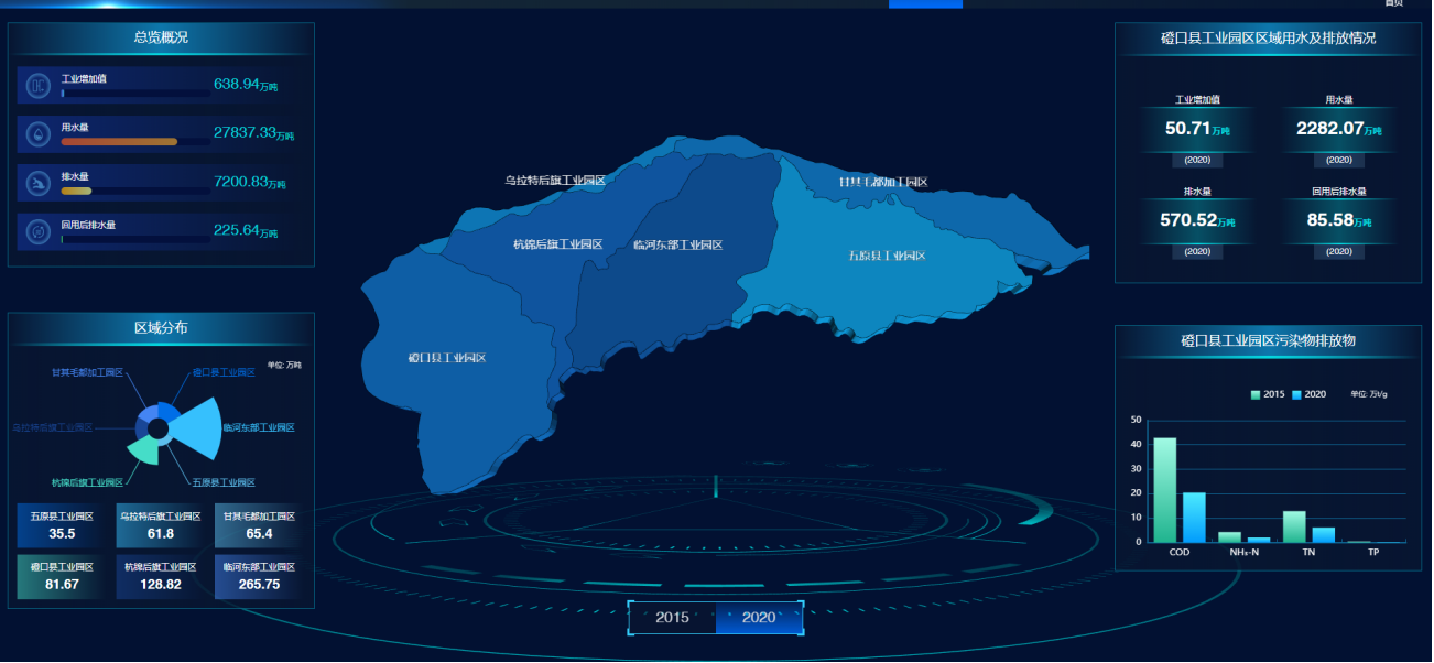 對(duì)重點(diǎn)區(qū)域排工業(yè)增加值、用水量、排水量、回用后排水量等數(shù)據(jù)作監(jiān)測(cè)統(tǒng)計(jì),可以通過并將這些數(shù)值在各工業(yè)區(qū)的分布情況以餅狀圖的形式展現(xiàn),對(duì)重點(diǎn)區(qū)域的排污情況精確掌握,便于制定相應(yīng)管理策略。