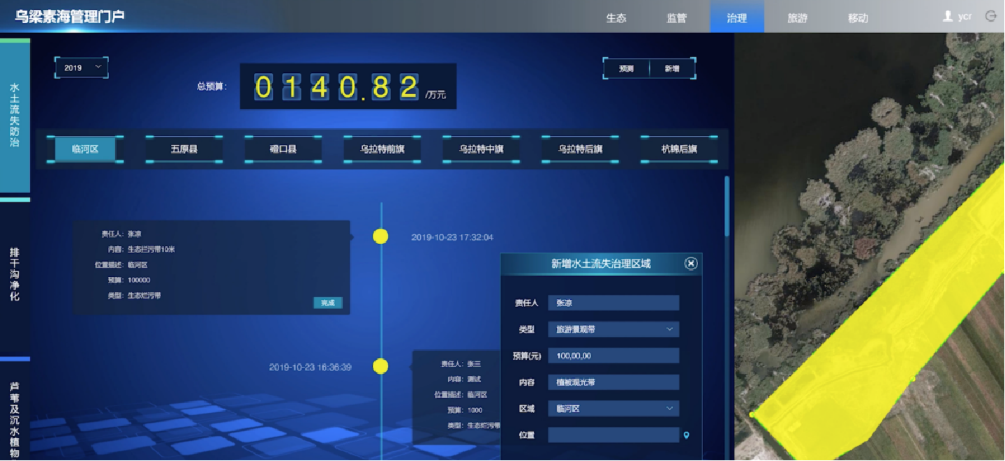 新增了水土流失防治、蘆葦以及沉水植物收割、排干溝凈化等方面,了解整年度水土流失工程防治及完成情況,對(duì)每個(gè)生態(tài)環(huán)保項(xiàng)目的負(fù)責(zé)人、經(jīng)費(fèi)預(yù)算以及區(qū)域面積等信息進(jìn)行詳細(xì)的統(tǒng)計(jì)展示。