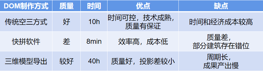 從三種方式制作的正射影像可以看出,質量方面?zhèn)鹘y(tǒng)空三方式制作的正射影像和通過三維模型導出的正射影像精度較好,快拼影像質量要差一些,尤其是高層建筑投影差明顯,甚至會出現(xiàn)錯位現(xiàn)象。三種方式制作正射影像的優(yōu)缺點如表所示。