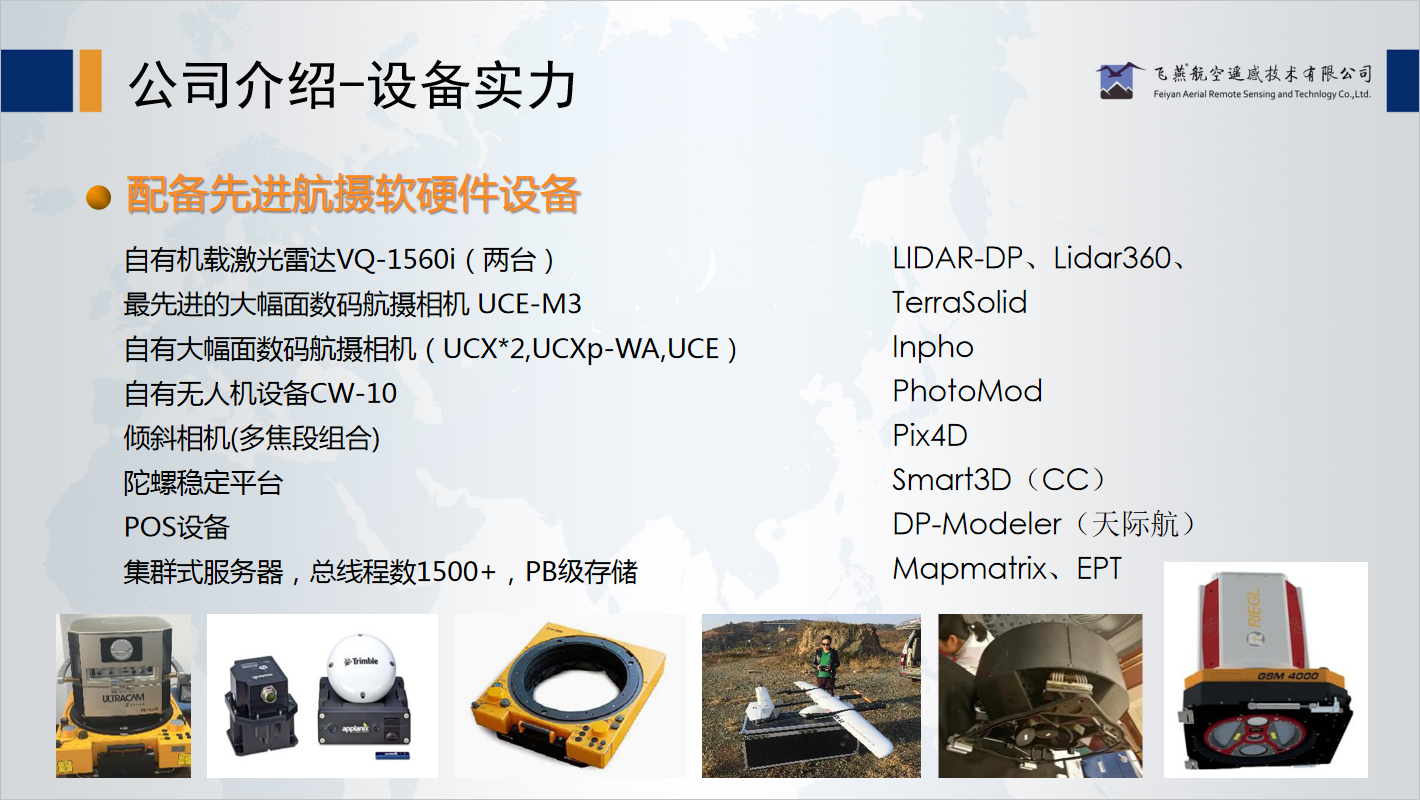 飛燕遙感配備兩臺機(jī)載激光雷達(dá)VQ-1560i、一臺5億像素傾斜攝影相機(jī)、五臺大幅面高精度UC系列數(shù)碼航攝儀、多種無人機(jī)及輔助設(shè)備,是全國航攝設(shè)備裝備最頂尖的企業(yè)之一。